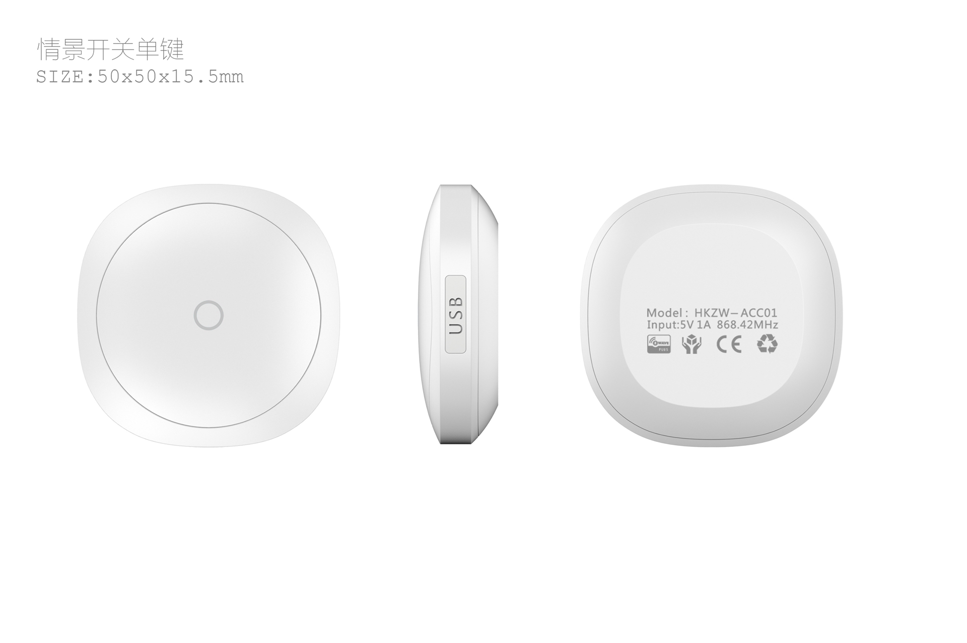 Features: • One-Button-Scene-Controller • Control 3 different scenes with the button - pressed, hold and released • Wall-mounted or portable • Low battery alert • Power supply: Micro USB 5V or Battery LIR2450 (rechargeable & included) • Wireless technologie: Z-Wave Plus TechInfo: Article Dimensions (WxHxL): 50 x 16 x 50 mm Package Dimensions (WxHxL): 68 x 45 x 68 mm Article net weight: 0.019 Kg Article gross weight: 0.050 Kg Z-Wave Plus: Yes WEEE: Yes CE: Yes IP-Rating: 20