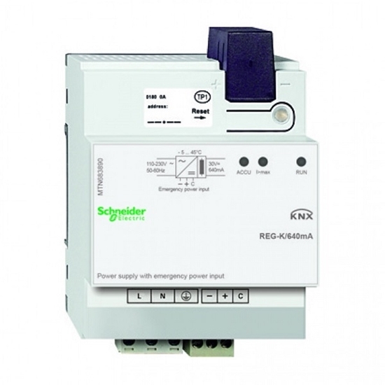 "description": "KNX System Power Supply REG-K/640 mA with emergency power input. Maximum current 640mA (KNX bus plus additional output consumption). Reset button and overload status LED, shortcircuit and overload protection. 230 V ~ 50/60Hz input voltage. Installation in DIN rail (4 units).",