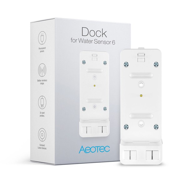 Con el Water Sensor 6 de Aeotec estás protegido contra daños por agua. Este dispositivo ya es genial, pero con el Water Sensor Dock lo es aún más. La instalación del muelle te ofrece varias ventajas. ",