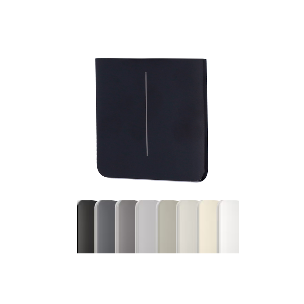 O Ajax SideButton 2G Vertical é a tampa frontal tátil desenhada especificamente para ser instalada nas extremidades (topo ou base) de painéis múltiplos verticais (Ajax Frame Vertical). Com a sua superfície dividida em duas zonas de toque, é a peça de acabamento essencial para os relés inteligentes Ajax LightCore de 2 botões (2-gang). Permite ativar duas linhas de iluminação independentes, quer por toque direto, quer por aproximação da mão (até 15 mm), garantindo um design limpo e higiénico.