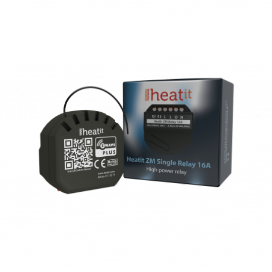 O Relé Individual Heatit ZM 16A é um relé de alta potência para instalações embutidas em caixas elétricas de parede europeias. O relé permite controlar dispositivos conectados através da sua rede Z-Wave ou por meio de um interruptor com fio.